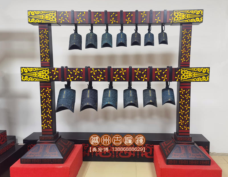 簡介:13件2層古編鐘,是根據(jù)曾侯乙編鐘設計制作,編鐘為青銅鑄造,采用標準音高A=440Hz調(diào)音,音階G4—A6。編鐘大梁采用優(yōu)質(zhì)松木制作,表面噴漆,彩繪花紋