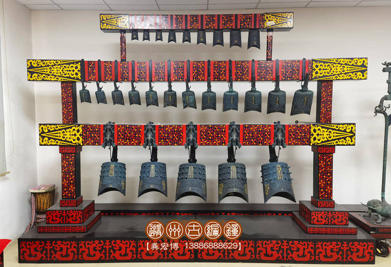 26件木結(jié)構(gòu)演奏級(jí)編鐘,是一套專(zhuān)業(yè)演奏類(lèi)古樂(lè)器,整套編鐘分3層懸掛排列,由長(zhǎng)短不同的三根彩繪橫梁和4個(gè)青銅佩劍武士立柱及2根圓立柱組成。編鐘由錫青銅鑄造而成,采用國(guó)際標(biāo)準(zhǔn)樂(lè)音音高A=440Hz調(diào)音,一鐘雙音,十二半音齊備,可以旋宮轉(zhuǎn)調(diào)演奏古今中外樂(lè)曲。編鐘下層懸掛5件倍低音甬鐘,音色低沉渾厚,在演奏中起烘托作用,使用鐘棒撞擊發(fā)音。中層12件編鐘從大到小依次排列,音色淳樸清澈,用于演奏樂(lè)曲主旋律。上層9件為倍高音鐘,音色清脆悅耳,用于演奏高音及復(fù)試旋律搭配。編鐘的彩繪橫梁采用優(yōu)質(zhì)實(shí)木板制作,表面噴漆并彩繪花紋;整套配套演奏工具一套,教學(xué)樂(lè)譜,另配有保管編鐘用的木箱,便于運(yùn)輸和儲(chǔ)存。